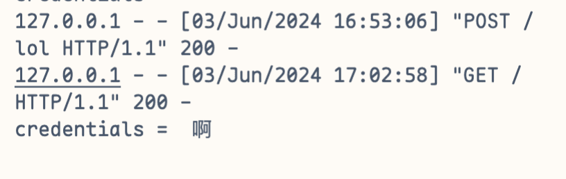 from flask import Flask, request, render_template app = Flask(__name__) @app.route("/lol", methods=["POST"]) def lol(): credentials = request.form.get("credentials") print(f"credentials = {credentials}") return "lol" @app.route("/")a def index() return render_template("index.html") app.run("0.0.0.0", 1337)